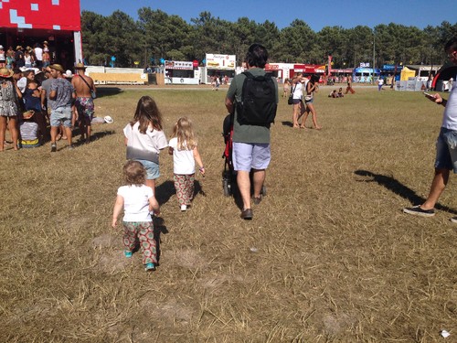 Foi tudo muito bom e fantástico e rematámos a semana com uma ida ao Meo Sudoeste. É uma espécie de tradição que se começa a impor. Nós íamos, agora elas vão connosco. Ficamos à tarde, curtimos o ambiente e deixamos que sejam massacradas pelo marketing das marcas. Só hoje: tatuagens na EDP, chapéus à cowboy do Meo, flores para o cabelo do Meo, colares de penas do Meo. Na roda gigante descobriram que existia um sítio para brincar (um serviço que a Santa Casa da Misericórdia de Lisboa passou a organizar este ano para miúdos entre os 4 e os 12 anos). Fomos lá preencher a papelada e deixámos as mais velhas. Quando voltámos, ao fim de meia hora, a Teresa tinha estado a brincar aos fantoches e estava a mascarar-se. A Madalena tinha estado a jogar futebol e desafiou o pai. Estiveram a jogar uma boa hora, enquanto a Quica se entretinha com outra bola e a Teresa se maquilhava e punha coroas. No fim estava suada como acho que nunca a vi. E contentíssima. Bom, isso estavam as três. Manter as coisas simples. Exatamente como ela diz.